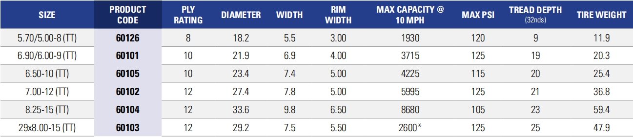 Tire load limits will be lower if used on continuous service Industrial Vehicles.
